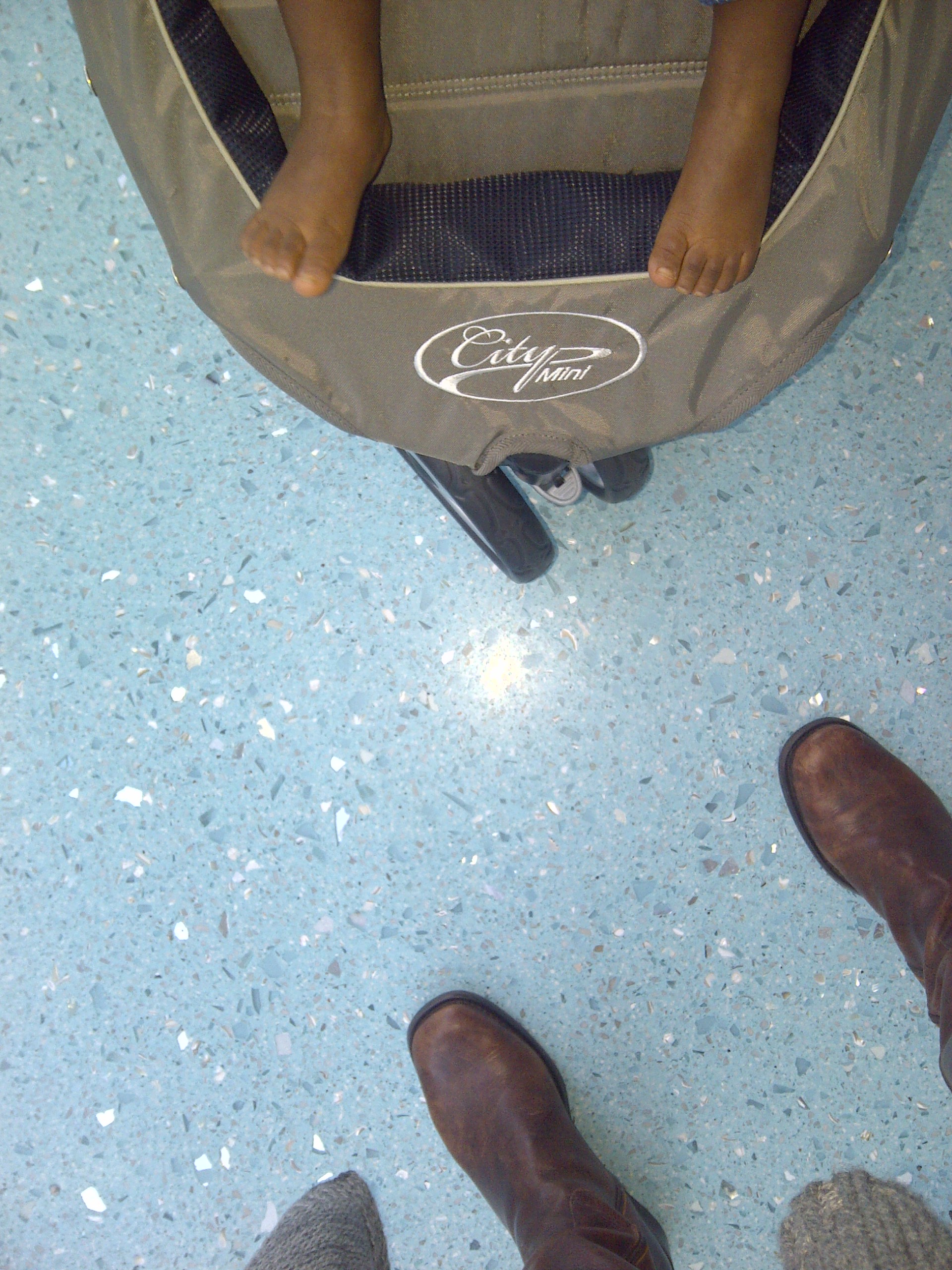 In the terminal before the flight, I decided it would be a good idea to feed GP.  Now, she has these great food pouches that travel well and she can feed herself with ease. Lately, she has been extremely fickle about having them though.  One minute she loves them the next she has thrown the entire pouch in a mini fit of rage.